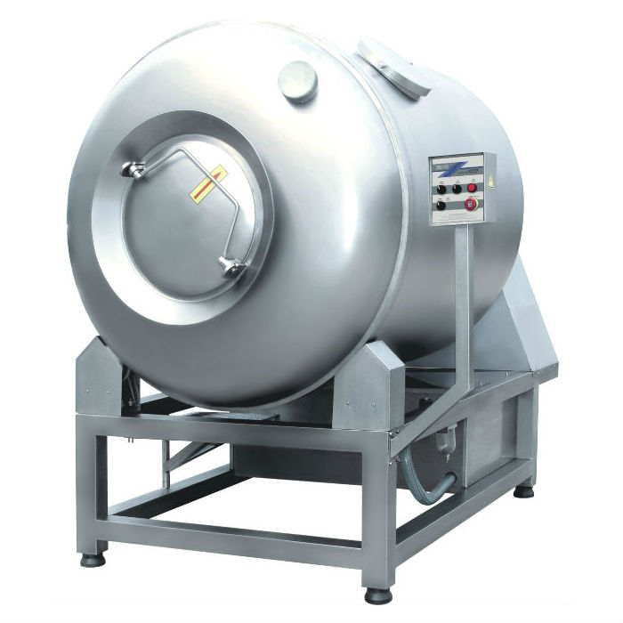 真空滾揉機(jī)是肉塊中能量轉(zhuǎn)化的一個(gè)物理過程。提高鹽溶性蛋白質(zhì)的提取,使腌制液在肉內(nèi)均勻分布并被充分吸收;增強(qiáng)肉的結(jié)著力,提高產(chǎn)品的彈性,改善制品的切片性,防止切片時(shí)產(chǎn)生破碎;增加保水性,提高出品率;增加產(chǎn)品的柔嫩性和結(jié)構(gòu)穩(wěn)定性。