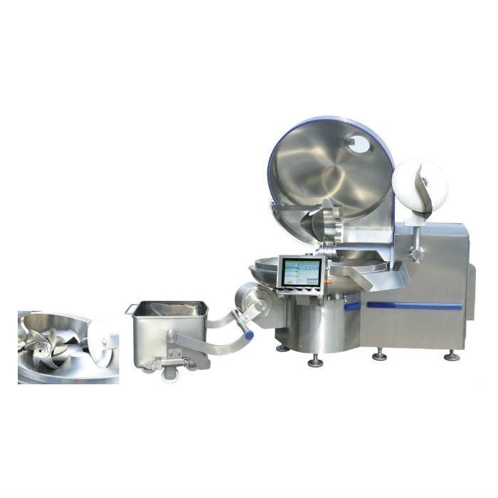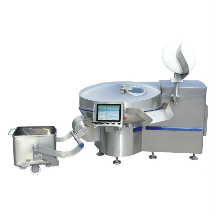 利用斬刀高速旋轉(zhuǎn)的斬切作用,將肉塊、碎肉、脂肪等主要原料精細的斬切成肉餡或肉泥,同時將其它原料如水,冰片,輔料一起攪拌均勻。